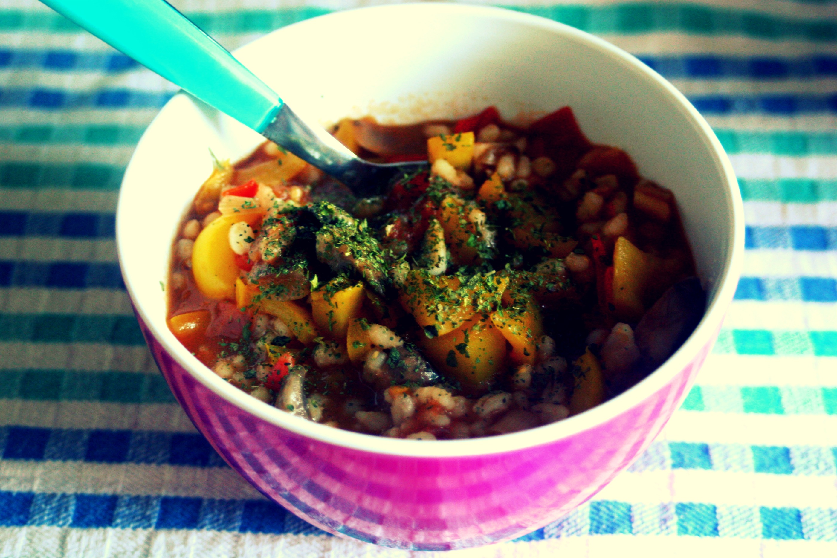 Rinse the barely and bring it to the boil on a high flame. Once it boils turn down to a simmer and cook for about an hour (or until it’s soft), as the whole barley takes a lot longer than the pearly type. In the meantime chop the garlic and onion to a mince and lightly sweat them with the hot oil in a sauce pan for a few minutes. Add the chopped pepper, tomato, mushrooms and minced stock cube. Cook them for about ten minutes or until the pepper softens up. The tomato will let out some water, in which the stock will dissolve. Add the boiled and drained barley to the pot of veggies and simmer for ten minutes, so that all flavours join together. Check for seasoning, although the stock should have made the soup flavoursome enough. Add the hot sauce (I go for plenty) and garnish with dried coriander leaves.